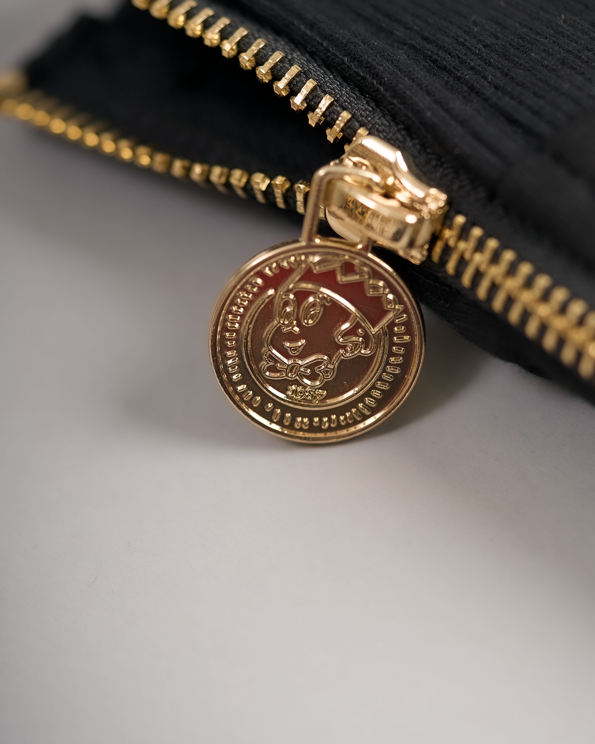 - Neck and side zippers adorned with custom gold Rich N. Spirit coin zipper pulls.