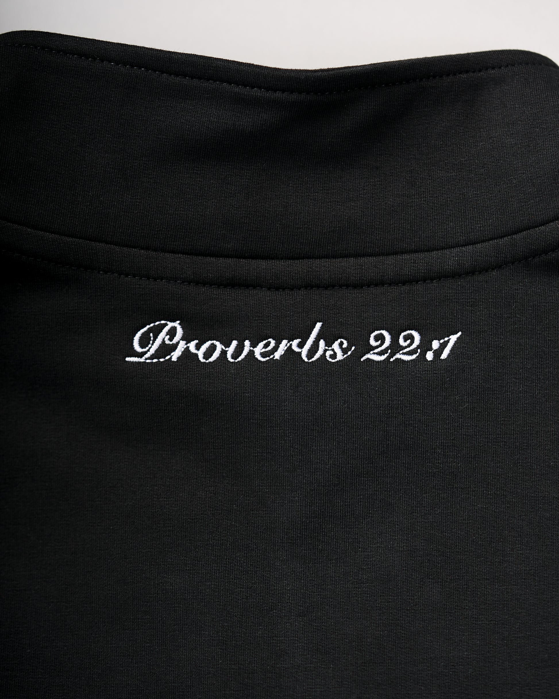- Back: Embroidered "Proverbs 22:1" logo at the neck.