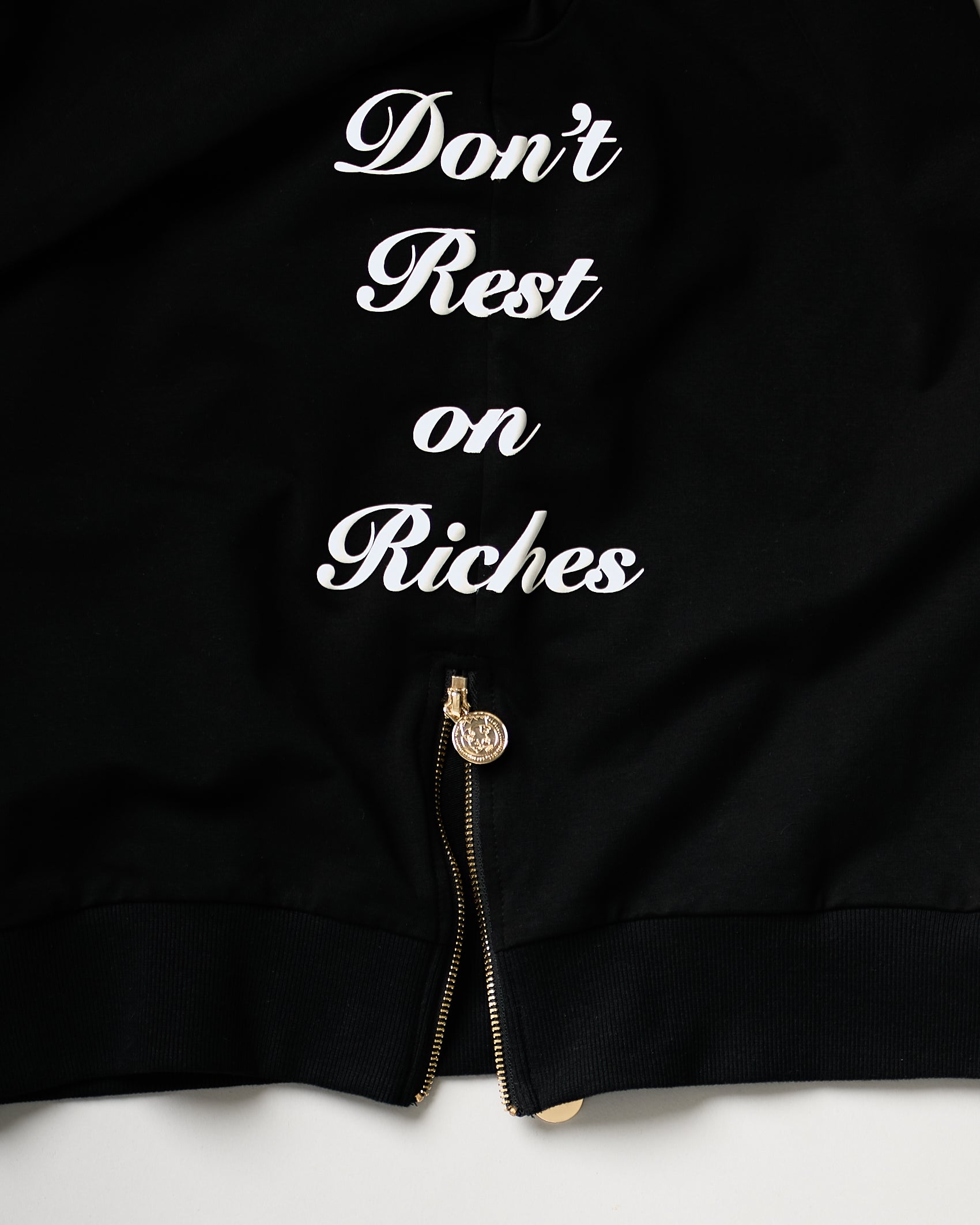 - Left side: "Don't Rest on Riches" printed in raised ink at rib cage.